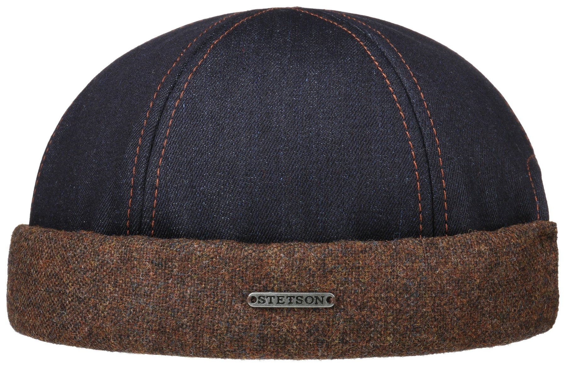 Docker Mützen oder sogenannte Skull Caps sind momentan bei der Herrenkopfbedeckung sehr gefragt. Der Ursprung dürfte eine Baseball Kappe gewesen sein, bei der man den Schirm weggelassen hat. Die Skull Cap soll - wie schon der Name (zu Deutsch Schädeldecke) sagt - vom Kopf des Trägers ganz ausgefüllt werden. Es handelt sich also um eine sehr sportliche Kopfbedeckung. Die Docker Denim 2ton von STETSON ist sechsteilig geschnitten. Der Aufschlag oder Steg aus Wolle ist kontrastierend in braun gehalten. Auch die Ziersteppnähte beidseitig der Nähte sind farblich mit demSteg abgestimmt. Die Docker Denim 2ton verfügt über einen Klettverschluss hinten, der eine Feinabstimmung der Kopfweite erlaubt.