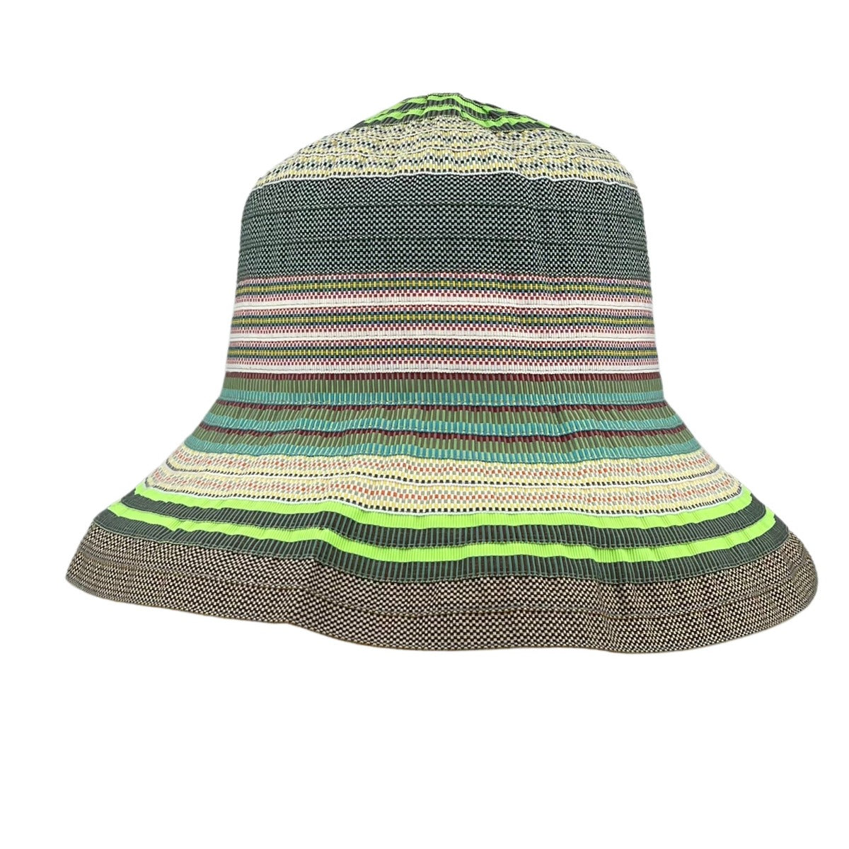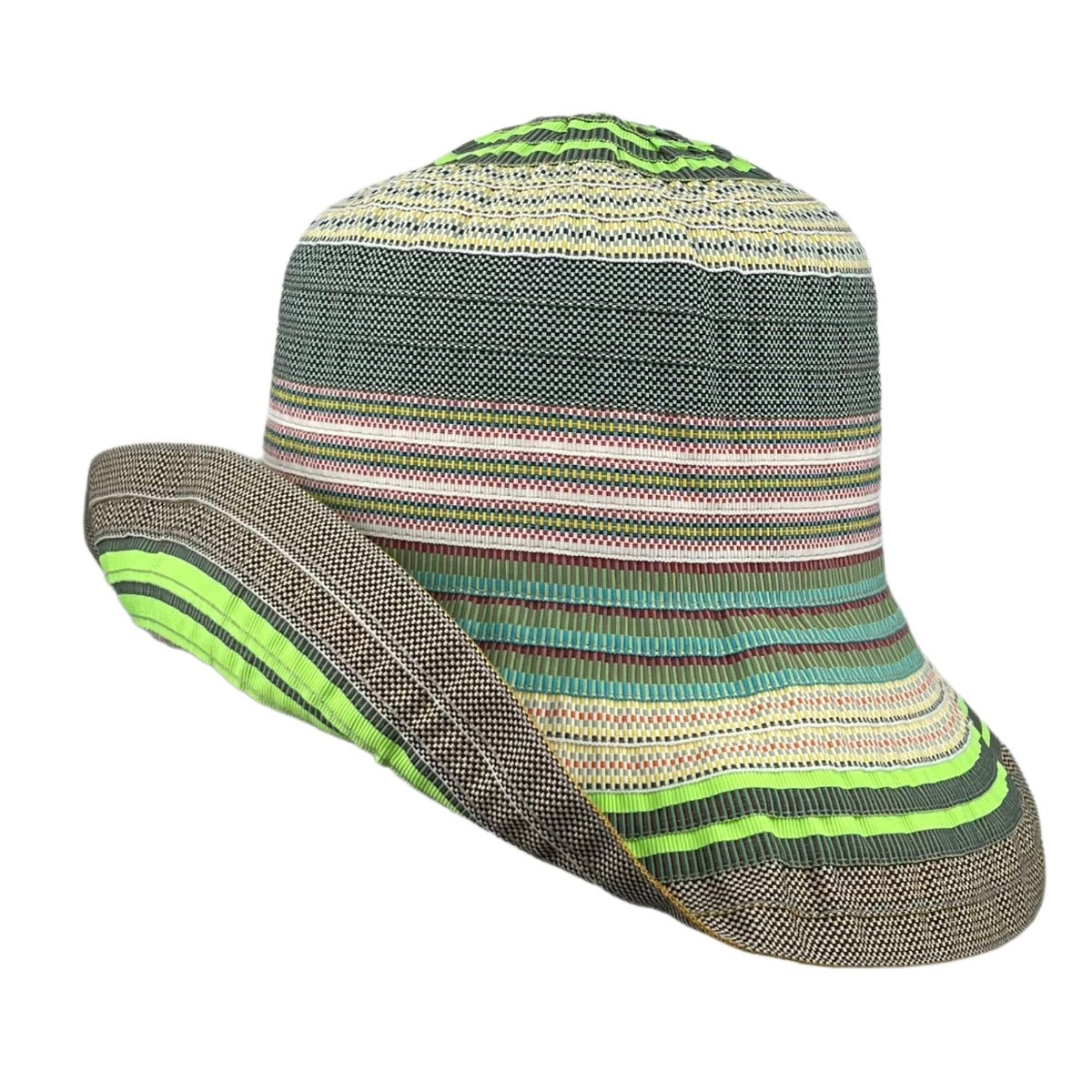 Dieser trendige Stoffhut ist ein echter Hingucker für sonnige Tage und lässt sich wunderbar vielseitig kombinieren. Das bunte Streifenmuster in frischen Farben wie Grün, Türkis, Braun und Rosa sorgt für sommerliche Leichtigkeit und einen fröhlichen Look. Besonders stylisch ist die breite, leicht geschwungene Krempe, die nicht nur modisch aussieht, sondern dir auch praktischen Sonnenschutz bietet.