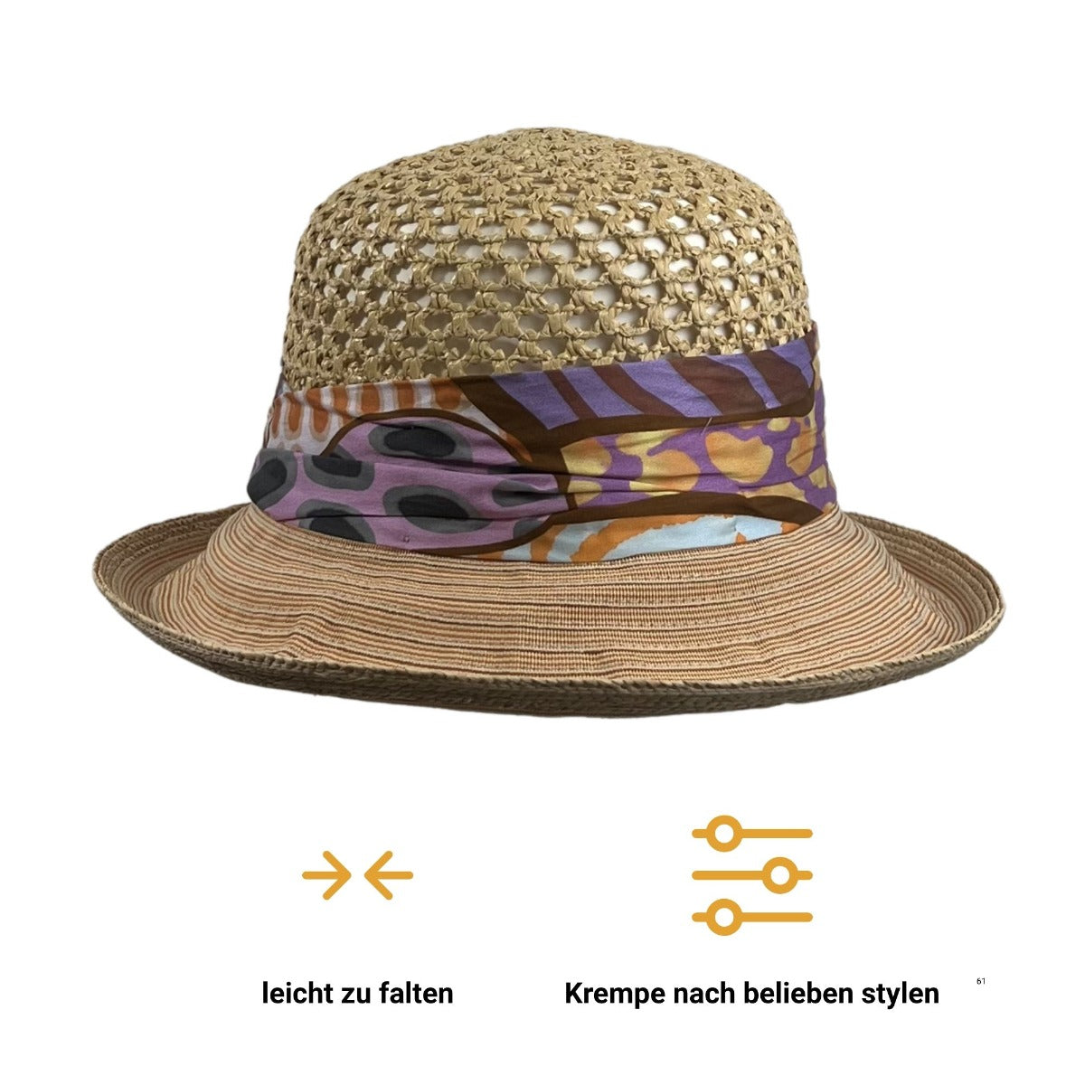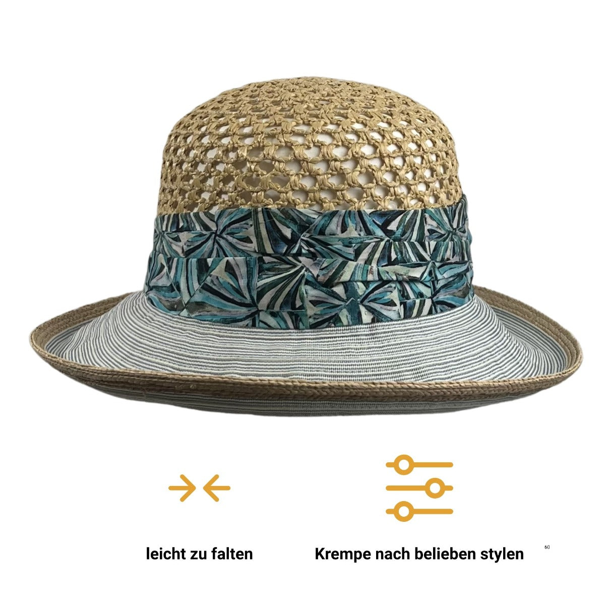 Die Kombination aus natürlichem Häkelstroh, gemustertem Stoffband und strukturierter Krempe macht diesen Hut zu einem vielseitigen Sommer-Accessoire, das zu unterschiedlichsten Outfits passt. Ob Urlaubsbummel, Strandpromenade oder Gartenparty – dieser Hut begleitet dich stilvoll durch den ganzen Sommer und bietet dabei zuverlässigen Sonnenschutz mit einem Hauch von Individualität.
